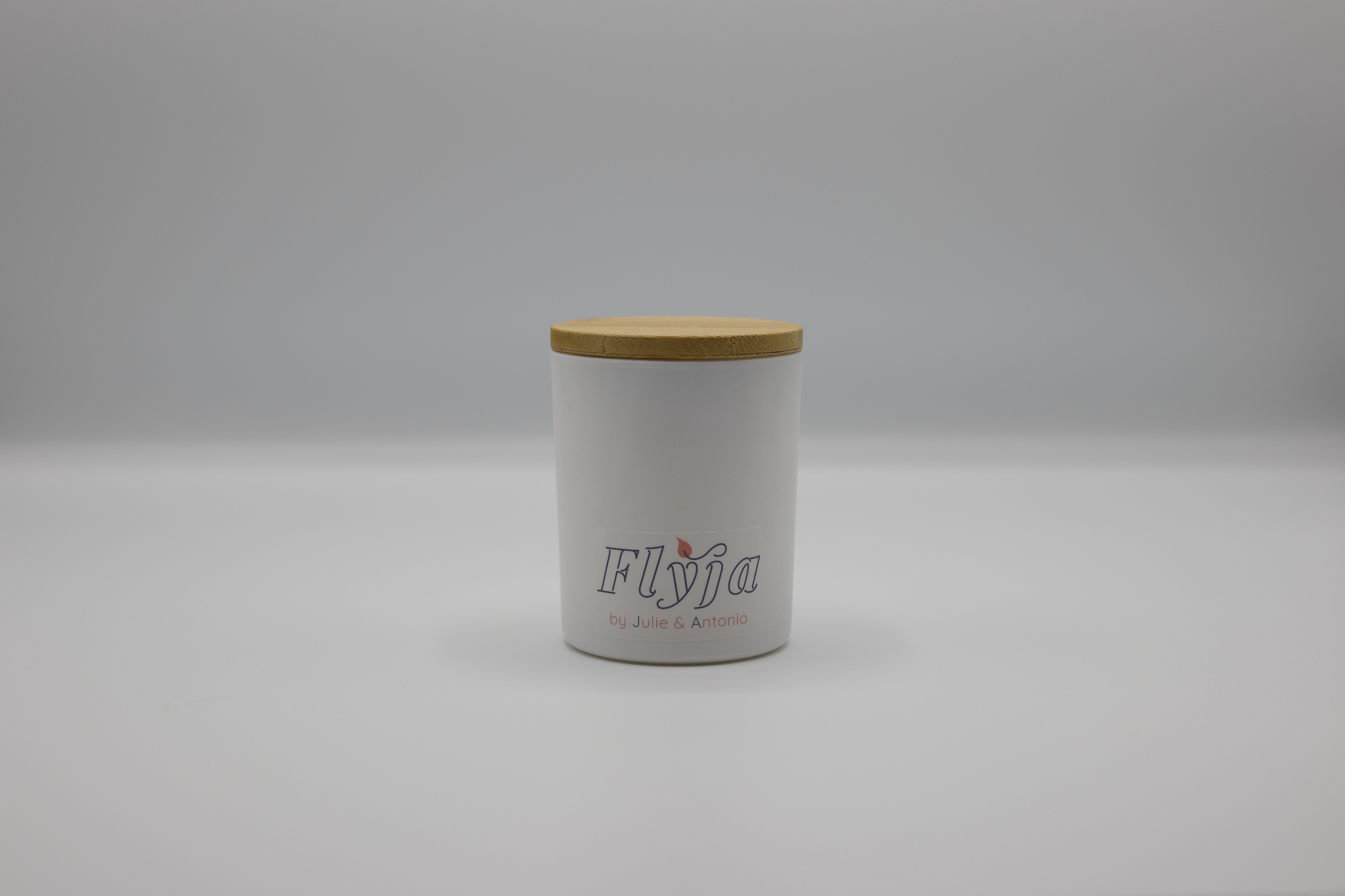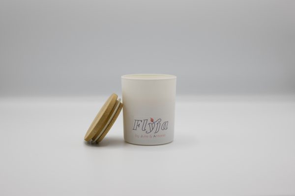 Bougie élégante, de couleur blanche, avec un couvercle en bois assorti.